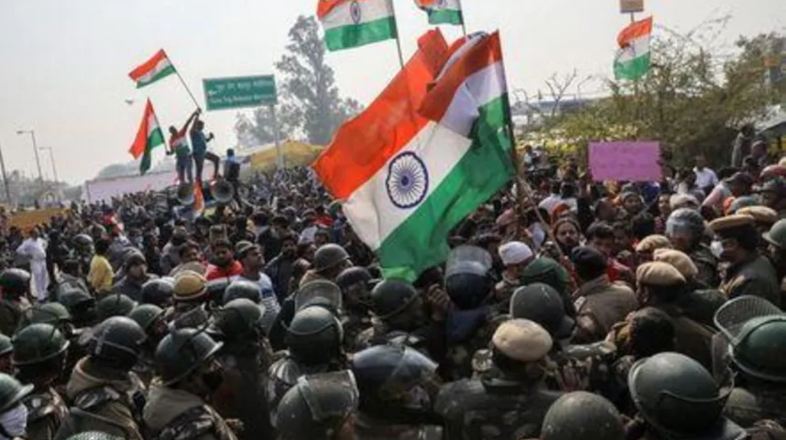 غیر ملکی خبر رساں ادارے ‘رائٹرز’ کے مطابق مشتعل گروپ کسانوں کے خلاف اور پولیس کی حمایت میں نعرے بازی کر رہا تھا۔